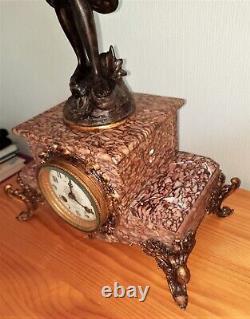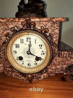 Chimes on the hour and half-hour. Statue signed, structure in pink marble in perfect condition. Left arm re-soldered at shoulder height, see photos 13 and 14.