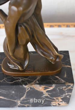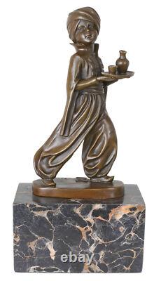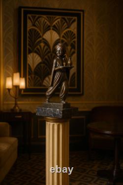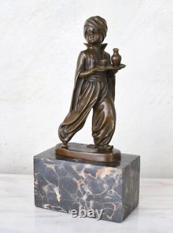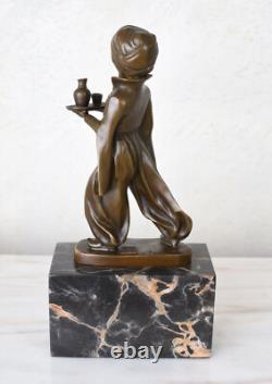 " Purchase from August 17, 2018. Art Deco bronze on signed oriental servant marble base. Art Deco Bronze "Villa Gatsby." The bronze sculpture of the "oriental servants" combines masterful craftsmanship and the timeless chic of Art Deco. Made of solid bronze, the figure impresses with detailed modeling, expressive facial features, and an elegant posture. The artist has finely elaborated all the folds of the robe inspired by the Oriental, so that light and shadow create fascinating reflections. Signed Preiss, it stands on a polished marble base that gives stability to the composition and a luxurious contrast.With a height of approx. 26 cm, a width of approx. 13 cm and a depth of approx. This exclusive collectible is compact enough for display cases, shelves, or desks, yet large enough to immediately attract attention. The combination of heavy bronze and real natural marble makes the figure a lasting investment for art lovers and gives each piece a touch of exotic origin and art.