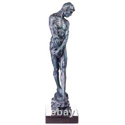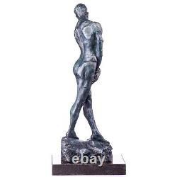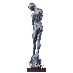 Sculpture of a Bronze Nude Male with Green Patina on Vintage Black Marble Signed