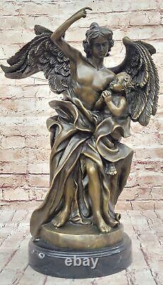 Graceful Guardian: the angel and the baby bronze sculpture. A muscular angel holds a beautiful, healthy baby with tender care in this stunning bronze sculpture. The angel's raised finger gently touches the precious baby, embodying a moment of pure affection and guardianship. Its majestic wings, widely spread in a W shape, are adorned with thick feathers, evoking the grace and strength of a bird in flight.