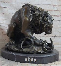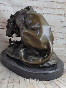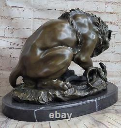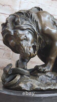 Immerse yourself in the captivating encounter between a majestic male lion and a venomous snake with this stunning bronze sculpture. The powerful lion asserts its dominance by crouching, emitting a fierce roar that intimidates the snake in a tense confrontation.