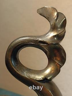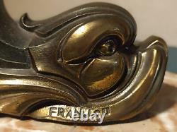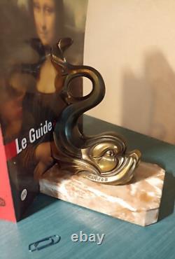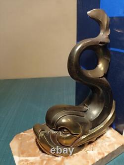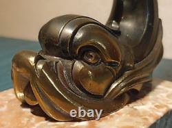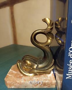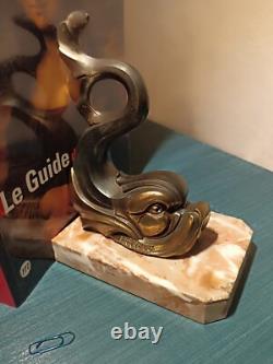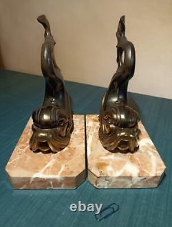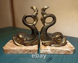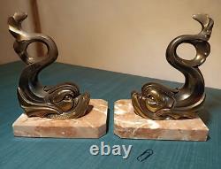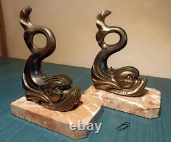 Ancienne paire de serre-livres, en métal cuivre? À patine bronze et or, sur terrasse en marbre rose veiné blanc, en forme de grotesques aquatiques ou dragons des mers, signés Franjou, Art Déco, années 1930.