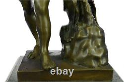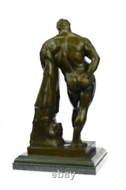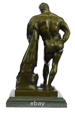 Si vous avez des questions veuillez nous contacter. Cette sculpture est en parfait état. Dimensions en bronze avec base en marbre : Hauteur 18,5" x Largeur 9 1/2" Dimensions du marbre : 10" X 8" Hauteur sans base: 17,5 Poids: 27 livres Inventaire: 15yrd84811651. Cette puissante sculpture en bronze représente un homme costaud dans toute sa gloire physique, mettant en valeur les détails méticuleux de sa musculature bien définie. Cependant, ce qui distingue cette ouvre d'art, c'est le récit qu'elle véhicule au-delà de la beauté superficielle de la forme humaine. L'homme, bien que physiquement parfait, porte le poids d'une blessure importante. Son bras est visiblement absent, lui laissant un profond sentiment de perte et de désir. Le regard de l'homme est fixé sur la main manquante, qui aurait dû compléter son physique robuste. Ce détail poignant ajoute de la profondeur et de la complexité à la sculpture, invitant les spectateurs à contempler les thèmes de la résilience, de l'adversité et de l'esprit indomptable de la condition humaine. Cela nous rappelle que même face aux revers physiques, la force intérieure et la détermination de l'individu peuvent persévérer. Fabriquée avec la plus grande précision et art, cette sculpture témoigne du savoir-faire de l'artiste Glycon. Utilisant l'ancienne méthode de la cire perdue, la sculpture capture à la fois les prouesses physiques de l'homme et la profondeur émotionnelle de son expérience. Il repose gracieusement sur un socle en marbre noir, procurant une sensation de stabilité et de permanence.Qu'il soit exposé dans une maison ou un bureau, « L'athlète blessé » n'est pas seulement une ouvre d'art mais un symbole stimulant de la résilience de l'esprit humain. Statue en bronze Glycon signée « Hercule » Mythe grec Hercule Nude Base en marbre Vente. Collez le lien vers une fenêtre de navigateur.